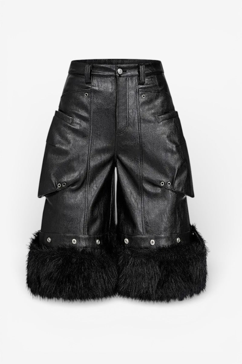 Bold and high-fashion, these black PU leather shorts feature striking faux fur patchwork and structured 3D pockets. Designed with a straight fit and knee-length cut, they bring a strong emo and high-street edge—perfect for statement outfits and modern alternative styling.