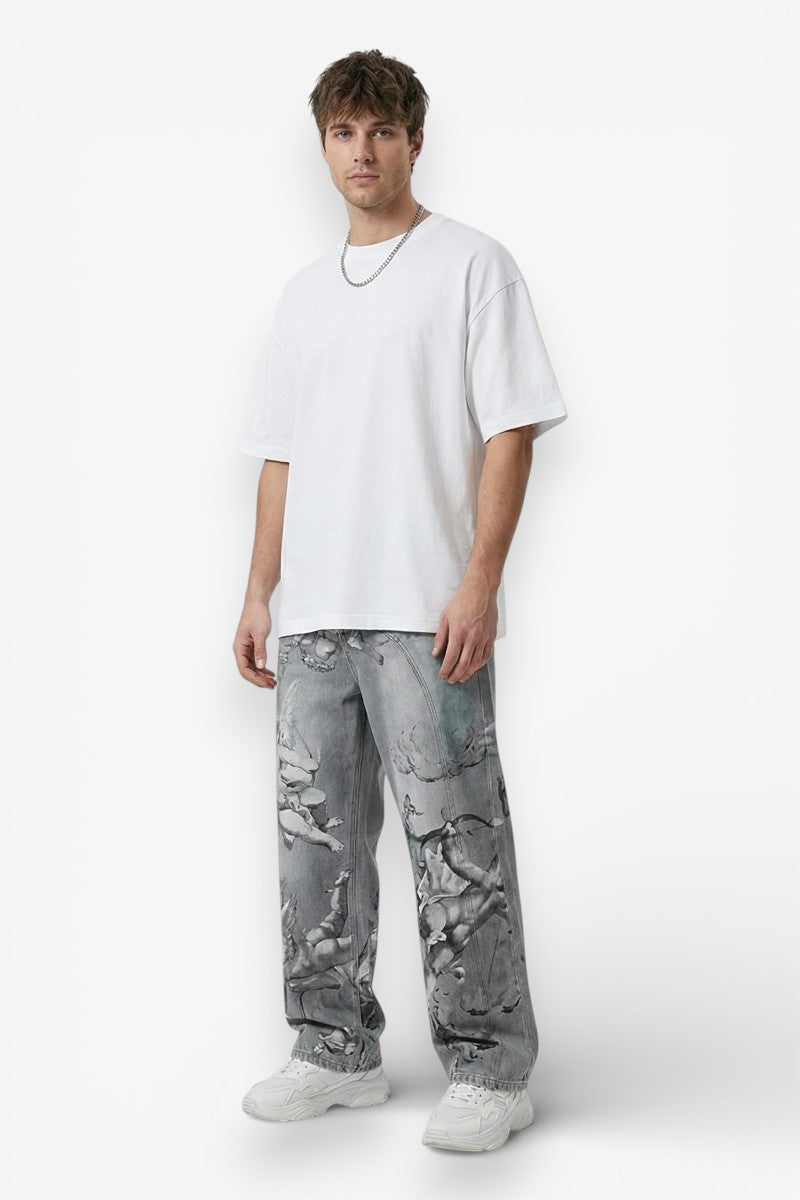 Trendy baggy jeans with a retro Cupid angel print, featuring a straight-leg fit and classic stonewashed denim. Perfect for unisex Y2K streetwear looks with an American hip-hop vibe, made for everyday casual styling in all seasons.