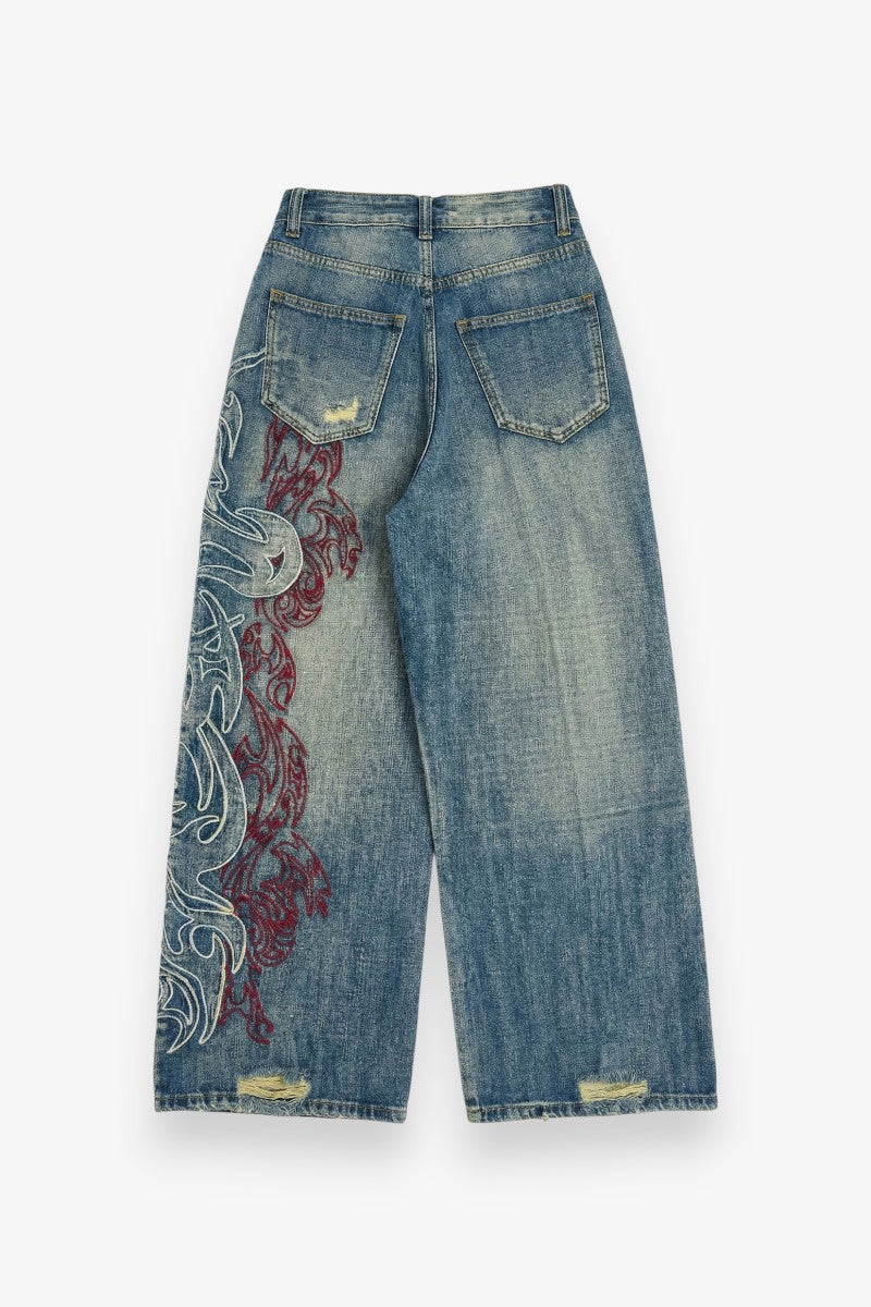 Embroidered Baggy Wide-Leg Jeans