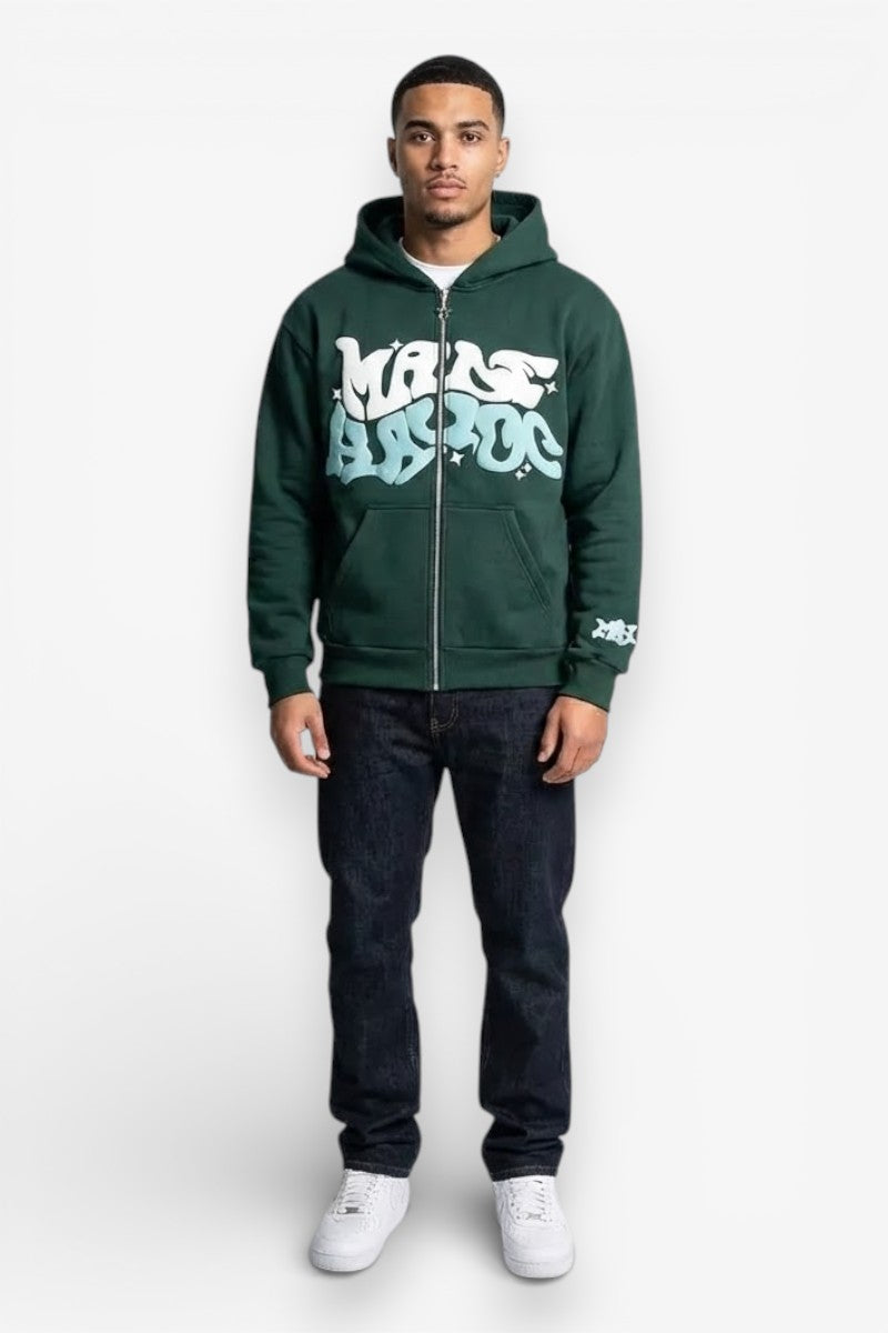 A relaxed American retro hoodie featuring bold star and letter prints with a full zip-up design. Perfect for spring and autumn layering, it blends Y2K streetwear energy with everyday comfort, easy to style for casual, street, or laid-back fashion looks.